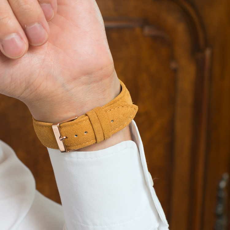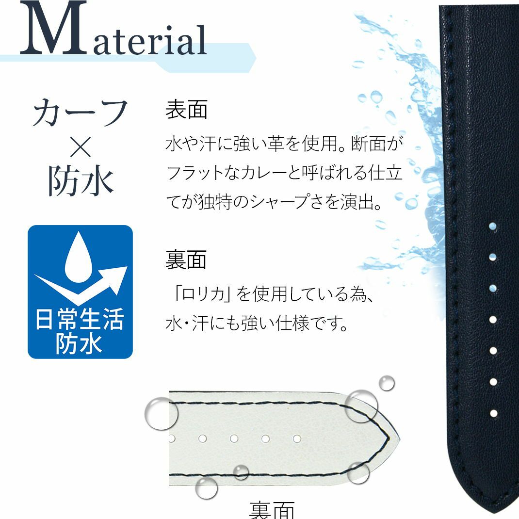 RIDING ライディング レザーにラバーコーティングを施したモデル。裏材にはロリカを使用し、水・汗に強い仕様となっております。取り付け部分に厚みがあり、厚手のパイロットウォッチ等にもおすすめです。 |